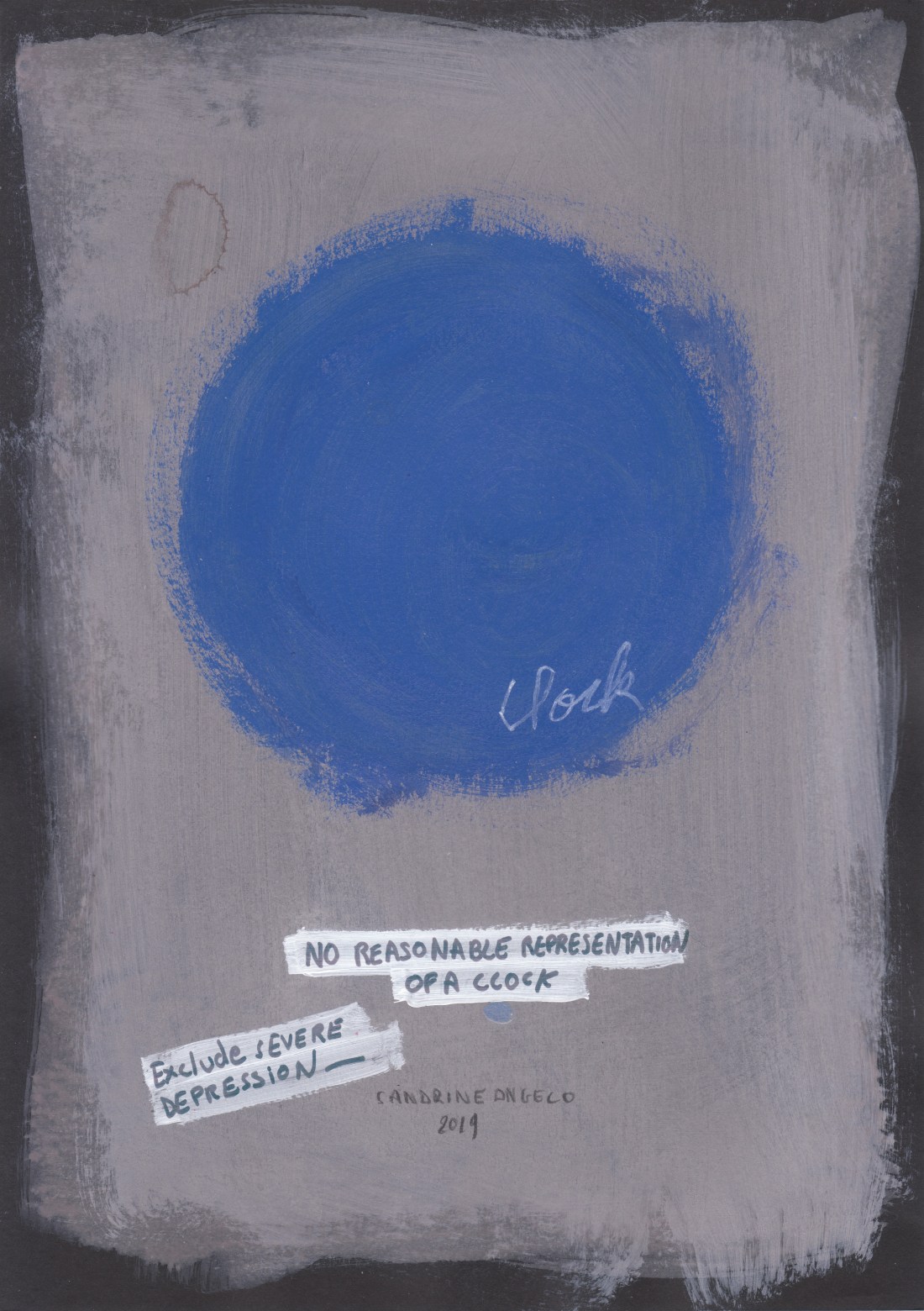“Moderate visuospatial disorganization of times”, The Clock Drawing Test, acrylic on paper, Sandrine Angelo, 2019“No reasonable representation of a clock”, The Clock Drawing Test, acrylic on paper, Sandrine Angelo, 2019“Severe level of visuospatial disorganization of times”, The Clock Drawing Test, acrylic on paper, Sandrine Angelo, 2019